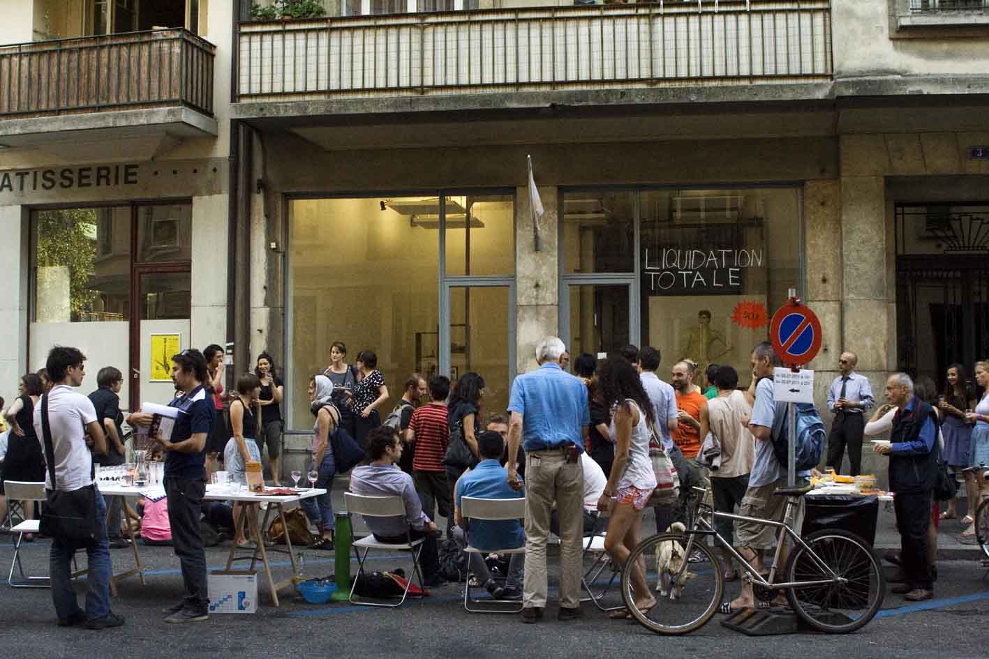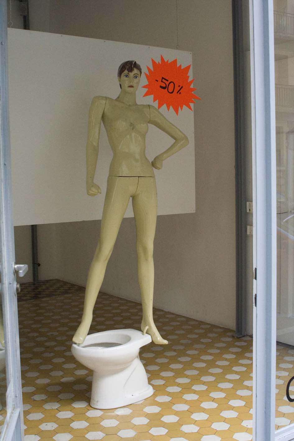 afin de détourner les codes habituels d'exposition. Son dispositif Liquidation totale reprend le visuel des commerces contemporains